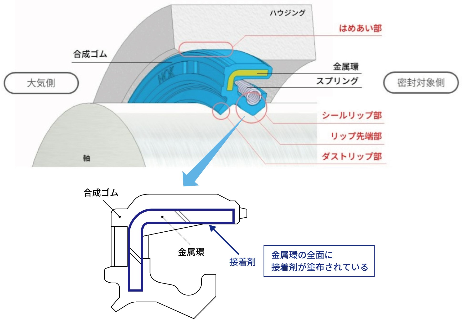 NOKの主要製品の一つであるオイルシールは、基本はゴムと金属環、バネを組み合わせてできている。これら異なる材料を一体化するのに接着剤が用いられる。しかしゴムと金属といった異種材料の接着は難易度が高く、さらにオイルシールが使用される環境に対応する必要がある。例えば、100度C超の高温下でも耐熱性や耐油性などを備えつつ、接着耐久性が求められる。NOKはこうした性能や仕様を実現するため、接着剤を60年以上自社開発してきた。