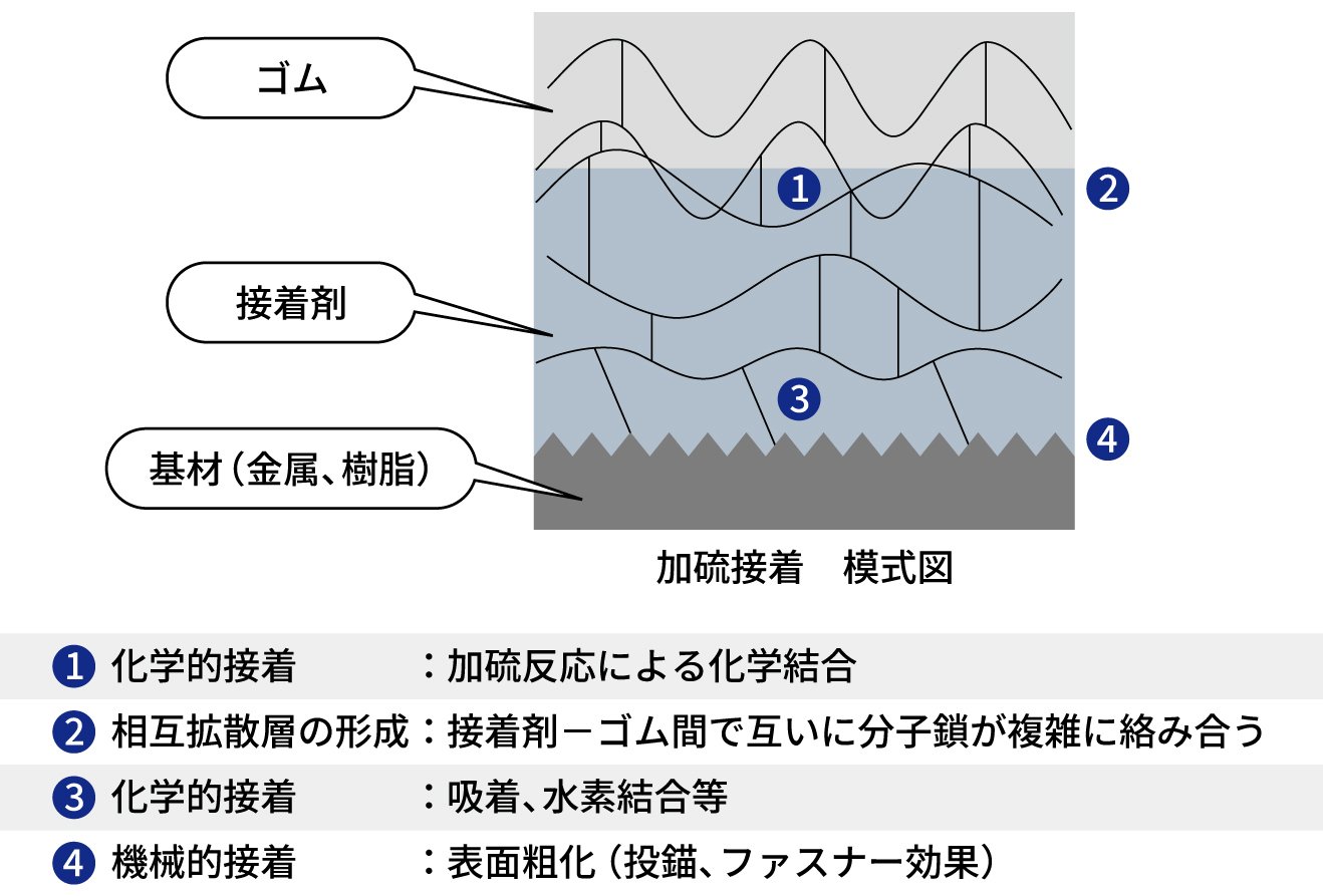 オイルシールの製造工程においてゴムと金属を接着する際に用いる「加硫接着」は、3つの接着原理が組み合わさったものだ。加硫成形を行う過程で、接着界面では分子間力による「物理的結合」と、化学反応による「化学的結合」が同時に起こる。複数の接着原理を同時に発現させるためには、接着剤の種類や接着処理条件、加硫成形条件(温度、時間、圧力等)など、非常に難しい制御が求められる。