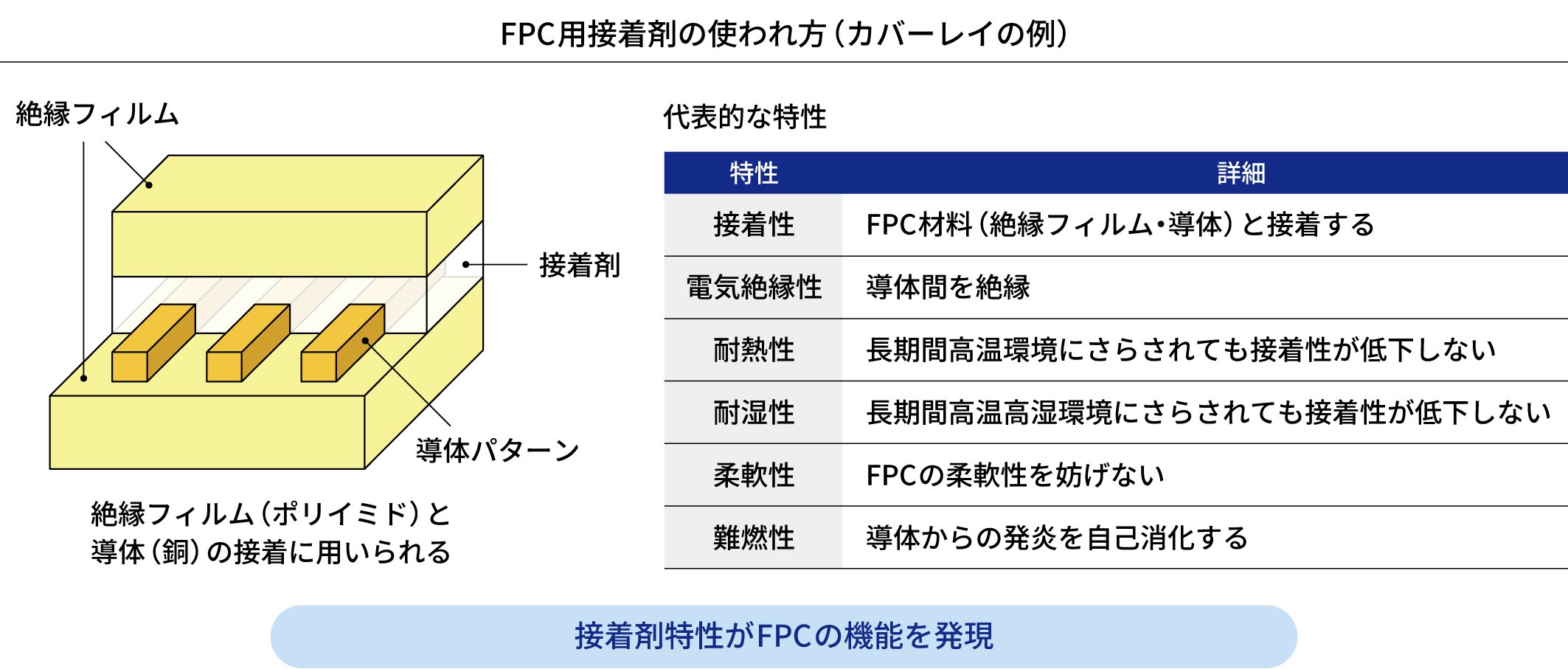 NOKグループのメクテック(東京都港区)が製造するFPCは、NOKが長年積み重ねた接着剤のノウハウを生かしている。FPCは薄く柔らかいプラスチックフィルム基板に回路パターンを形成したプリント基板。繰り返し折り曲げられるためスマートフォンやパソコンだけでなくさまざまな電子機器に採用されており、小型化にも貢献している。FPCはフィルムに接着剤で銅箔を貼り合わせたものに電子回路を形成して、カバーフィルムを貼り合わせる。この時に接着剤が用いられるが、接着剤自体にも絶縁性を持たせる必要がある。さらに耐熱性、耐湿性、柔軟性、難燃性を備えることが必要であり、接着剤がFPCの機能に重要な役割を果たしていることが分かる。