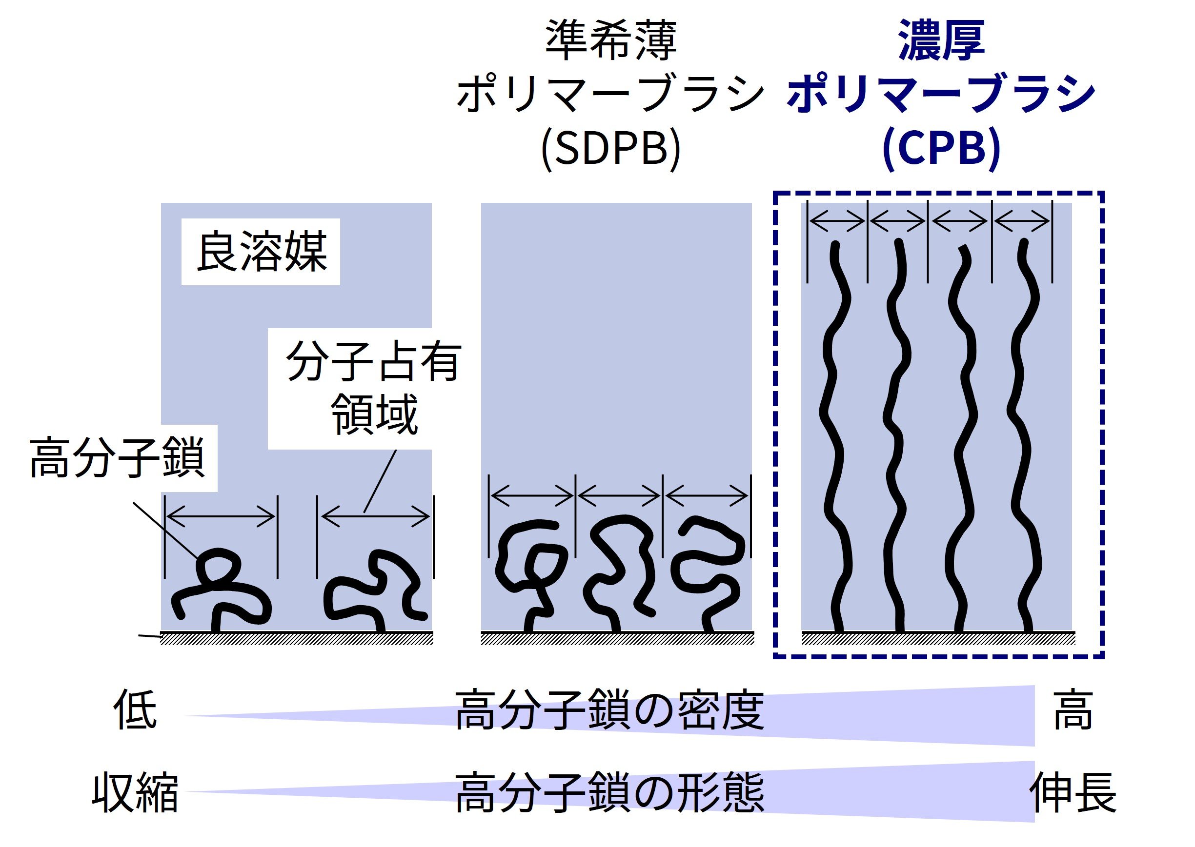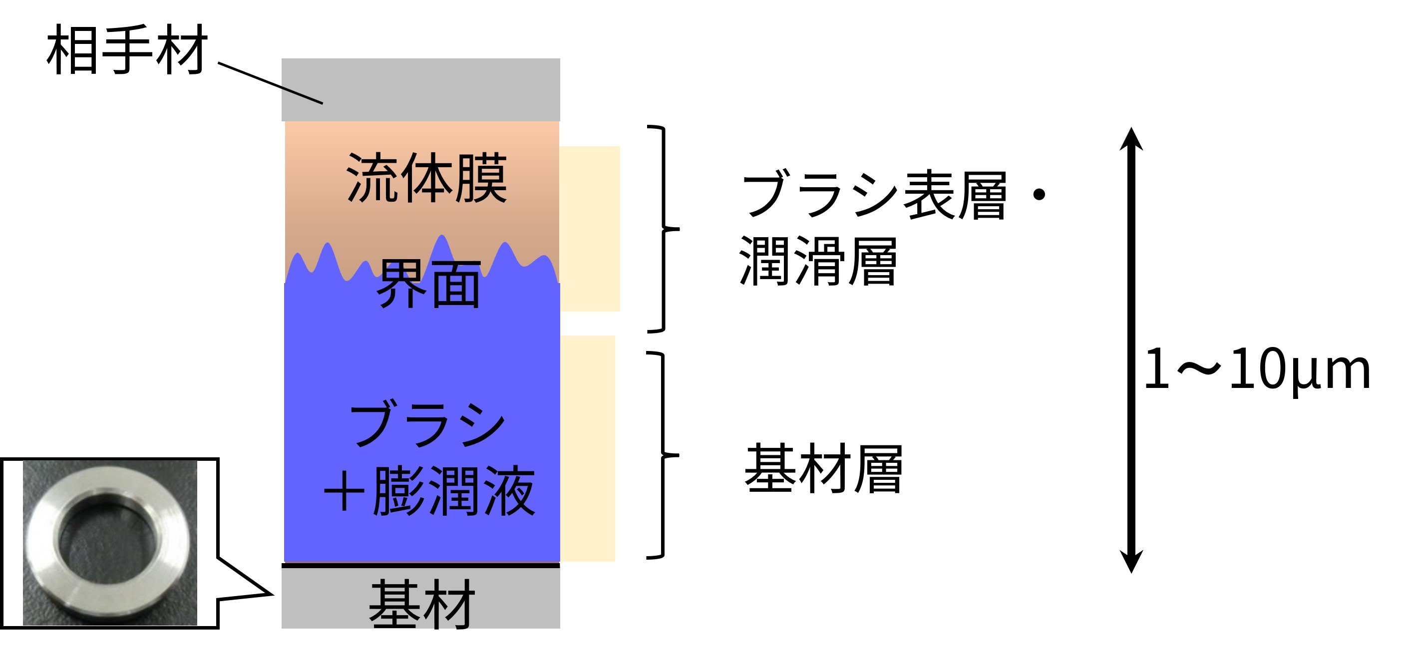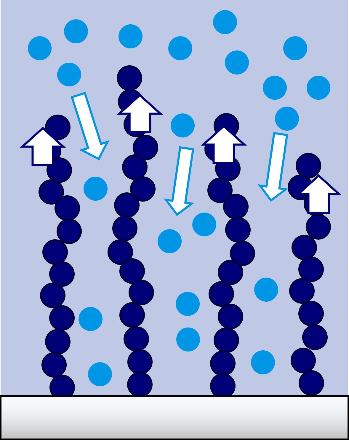 ポリマーブラシは膨潤性という性質を持つ。歯を磨くときに歯ブラシが水を蓄える様子を見たことがあるだろう。同じようにポリマーブラシはブラシ構造の内部に液体を保持できる。これによって擦れ合う材料の間により厚い潤滑液の膜を張ることができるため、摩擦を低減できると考えられている。